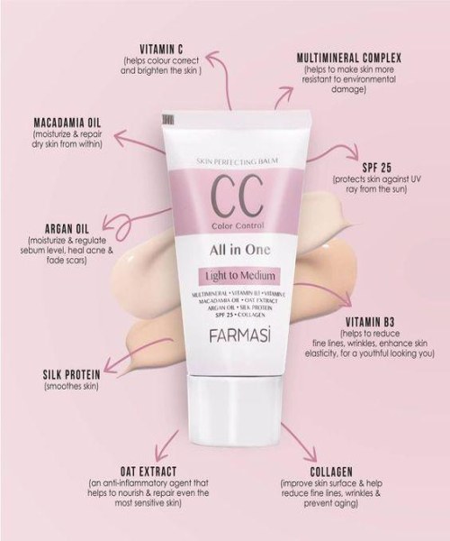 سی سی کرم فارماسی به خاطر پوشانندگی بهتر نسبت به بی بی کرم برای برای خانمهایی با سن بالاتر یا با جوش و لک زیاد مناسب است. تفاوت BB کرم و CC کرم در قدرت پوشانندگی آن است. اگر پوست خشک دارید یا دارای لک و چین و چروک دارید بهترین گزینه استفاده از CC کرم خواهد بود. CC کرم فارماسی اصلاح کننده رنگ پوست که حاوی مواد مغذی است.